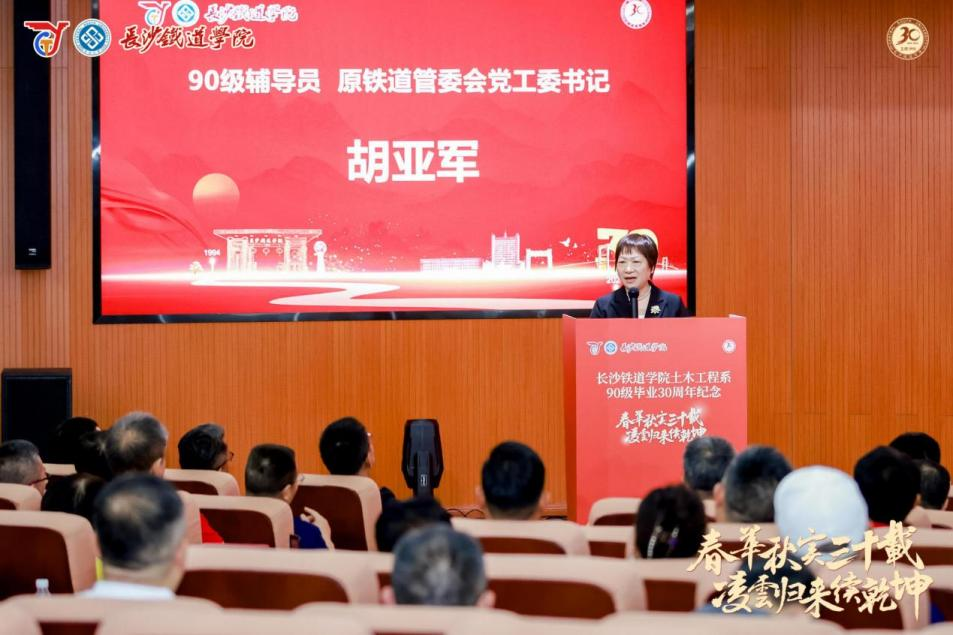 原铁道校区党工委书记胡亚军代表90级辅导员发表讲话,回忆了90级员工在校期间的学习、生活趣事。她表示对90级员工如今取得的卓越成就感到欣慰与自豪,深情地说:“在我执教生涯的37年中,当辅导员培养员工是令我最骄傲的时光”,并向90级员工送上了美好的祝愿。