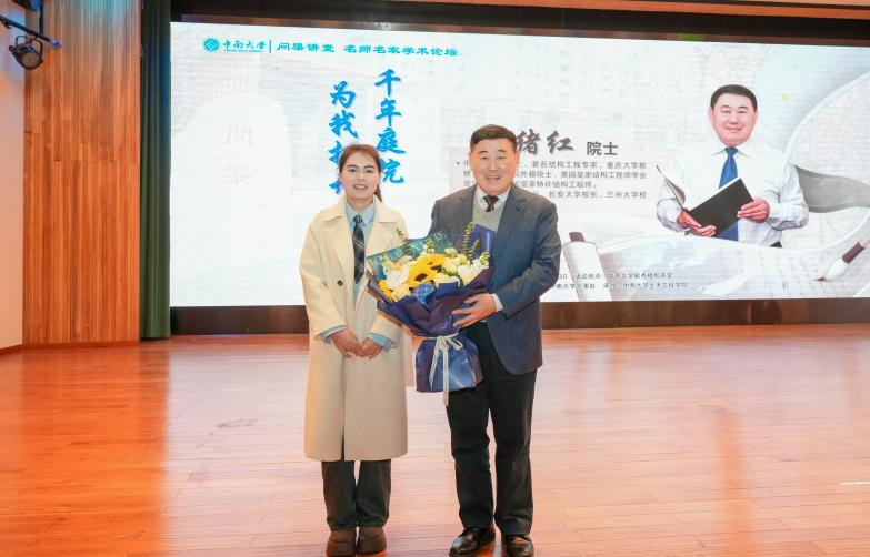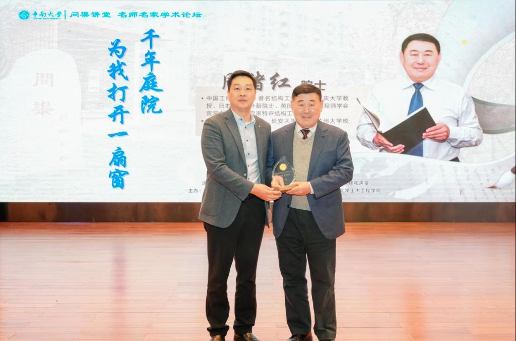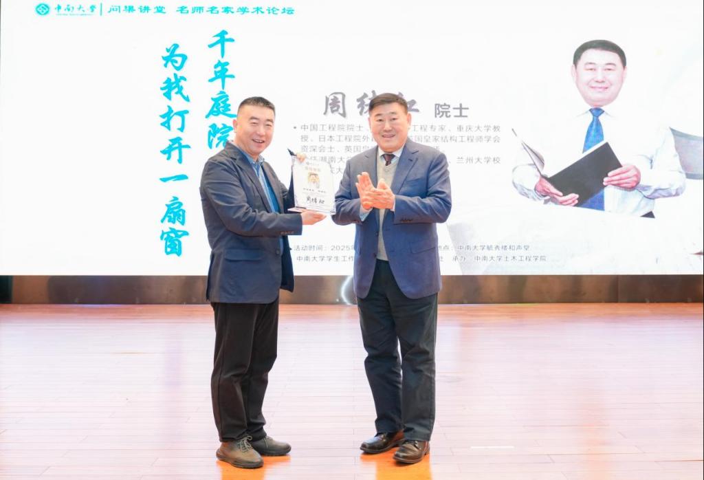 互动交流环节,周院士还悉心解答了同学们关于土木行业未来发展趋势、青年科研人员职业规划等一系列问题,展开了深入讨论交流。现场掌声雷动,同学们反响强烈,互动交流环节结束后,员工代表向周院士献上鲜花表示感谢,何旭辉副董事长为周绪红院士递赠名师名家论坛嘉宾纪念牌。