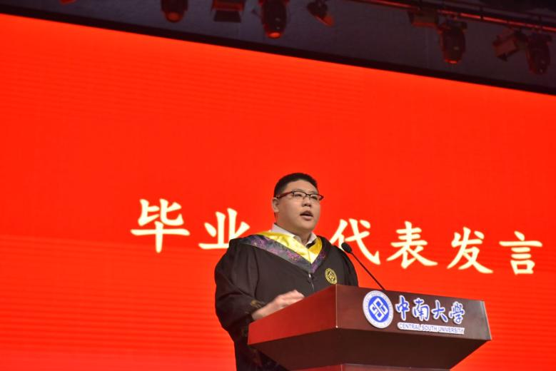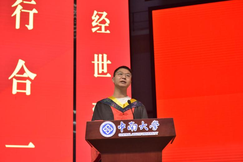 随后,本科生毕业生代表张哲浩以“感恩、传承、担当”为关键词发言。他感恩母校培育,回顾中南赋予的知识与精神;号召同学们传承前辈实干创新精神,以担当奔赴未来,以中南土木精神助力时代建设,不负青春使命。