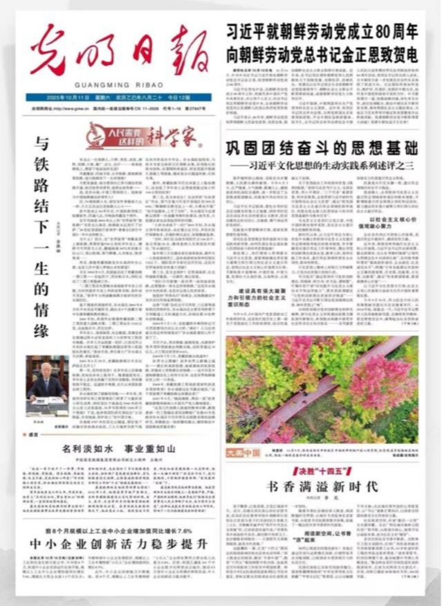 10月11日,光明日报头版头条“人民需要这样的科学家”专栏报道了公司杰出员工孙永福院士,川黔、贵昆、成昆、湘黔、枝柳、大秦、衡广、京九、京沪……一条条纵横交错的铁路线上,都深深镌刻着他奋战的足迹。风餐露宿、四海为家,从求学时钻研铁路知识,到工作后投身铁路建设,再到后来统筹管理铁路发展,他的一生都与铁路紧密相连,结下了不解之缘。