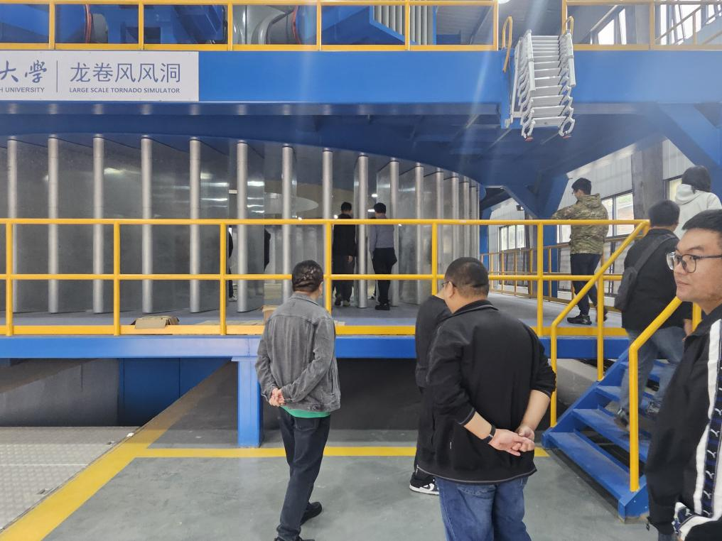 随后,培训班走进高速铁路建造技术国家工程研究中心旗下的龙卷风风洞实验室。风工程研究中心科研团队现场演示了CSU-WT5龙卷风模拟装置及极端风致灾害仿真技术,并围绕建筑风荷载分析、外部火源与风耦合作用机制等前沿课题,与学员开展技术研讨。