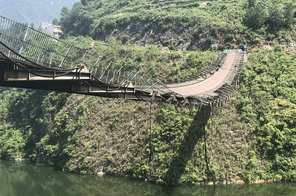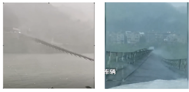 5月3日下午2时许,贵州省铜仁市思南县香坝镇遭遇暴风雨,狂风持续了约半小时,牛角岩附近的两座铁索桥在狂风中“荡秋千”,上下翻飞,剧烈摆动。这次大风导致两座桥都受损,一号桥两侧栏杆损坏,桥面出现不同程度受损,二号桥桥面受损严重,单侧主缆断裂内卷,桥面严重倾斜。为了安全起见,目前两座桥都已被封闭等待维修,禁止人车通行。铁索桥位于贵州思南县香坝镇,距离思南县城50公里,它飞架于乌江之上,桥梁全长285米,净跨238米,是连接乌江两岸两个乡镇的重要交通要道。桥梁受损封闭给来往于桥梁两岸的行人行车造成了极大不便。