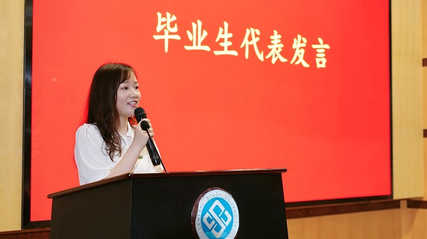 毕业生代表工程管理系硕士研究生罗吴赞发表了毕业感言。她从结合研究生的学习历程从感谢自己、感谢导师、感谢公司三个层次表达了对过去的回忆与对未来的展望,并鼓励大家成为能够坚持追逐理想的人、敢于创新实践的人、勇于奉献前行的人。