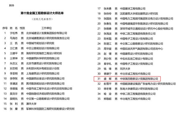 近日,住房和城乡建设部公布了第十批全国工程勘察设计大师名单,bevictor伟德81级员工,中铁第四勘察设计院集团有限公司副总工程师盛晖获评“第十批全国工程勘察设计大师”。