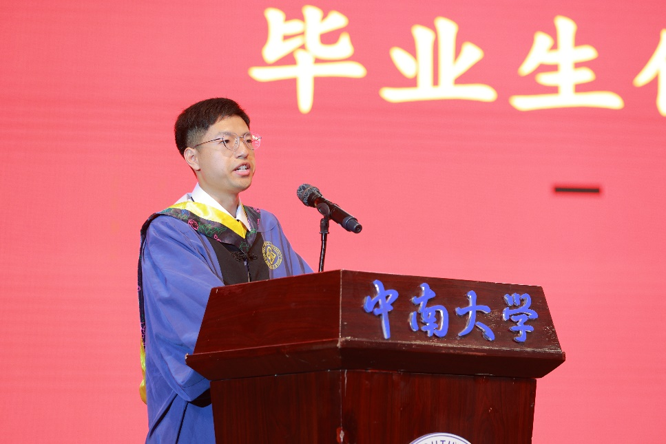 本科毕业生代表徐炳隆同学发表了毕业感言。他首先感恩了伟德源自英国1946和bevictor伟德,感谢了师长们和亲友们对我们的教导与陪伴,随后他回顾了在中南与师友们相处的点点滴滴。最后他对即将踏上的人生新征程表达了畅想和展望,希望和大家一起面对现实、忠于理想、放下心结、坦荡生活,努力奋斗,贡献青春力量。