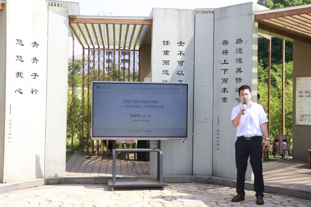 杨孟刚教授围绕桥梁如何改变中国、桥梁工程面临的困难和挑战两大核心论题与同学们进行分享。他从湘江上的桥梁建设出发,详细介绍了桥梁建设的创新理念和智能建造相关理论,通过生动的实例和深入浅出的讲解,带领大家了解了桥梁工程的最新进展和前沿技术。杨教授指出,学科交融是当代科学发展的一个重要主题,桥梁专业也需注重多学科的融合发展,鼓励同学打开创新思维,注重学科交叉的学习与思考,为传统工科学习带来更多创新和突破。