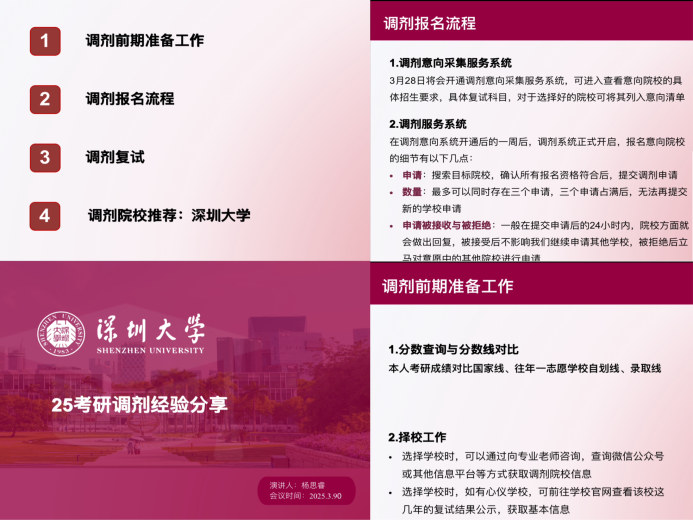 杨思睿员工结合自身调剂至深圳大学的经历,详细梳理调剂流程中的材料准备、沟通技巧与心态调整,并分享选择深大的区位优势与学科资源,为考生提供多元参考。