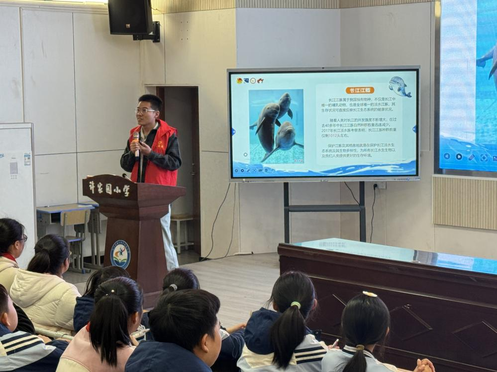 活动在主持人亲切的互动中拉开序幕。宣讲志愿者结合图文演示与生动视频,首先阐释了国家推进绿色发展、建设生态文明的政策导向,强调了保护生态环境、守护河流与野生动物的重要意义。随后,通过具体生活案例与科学讲解,系统介绍了垃圾分类、资源节约、低碳生活等环保知识与实践方法。现场穿插的互动问答与情景解析,让政策理念与生活实践紧密结合,在孩子们心中悄然播下了绿色生活的种子。孩子们积极参与,踊跃举手回答问题,在轻松愉快的氛围中掌握了环保技能。