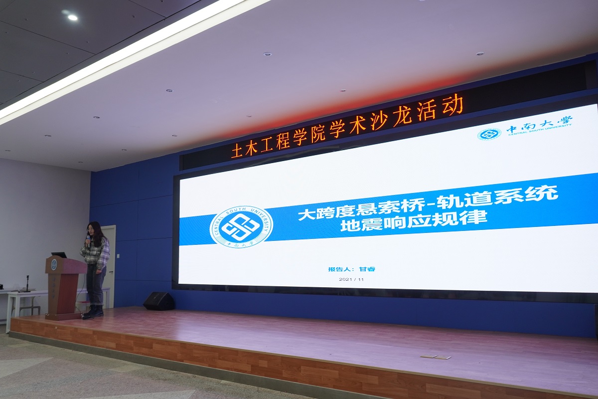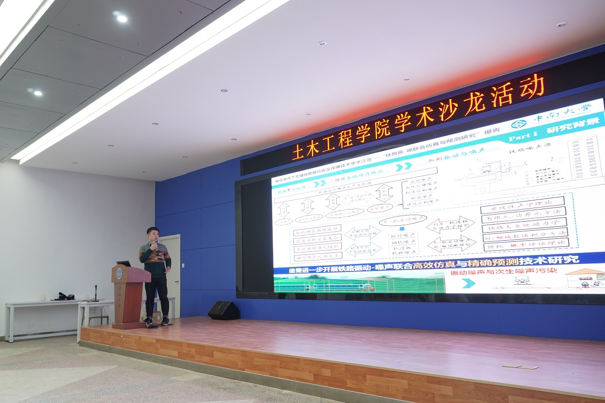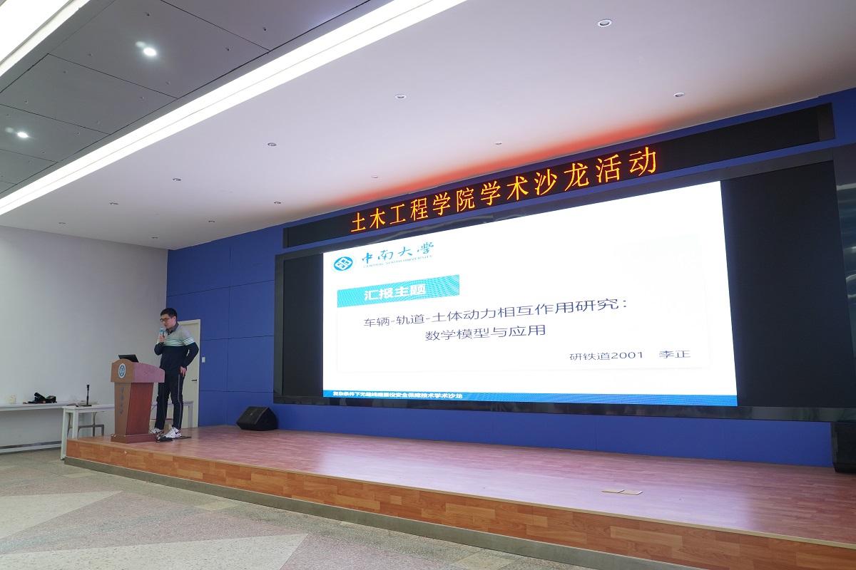 为此,徐磊老师为我们讲解了《铁路列车-结构系统动力相互作用研究》,分析了我们当前面临的问题和重大挑战并介绍了相关基本模型以及当前的研究进展。20级硕士研究生李正为我们介绍了《车辆-轨道-土体动力相互作用研究》,从研究背景、理论构架与数学模型、数值算例三方面进行一一分析。20级硕士研究生朱仔旭为我们汇报了《铁路振-噪联合仿真与预测研究》,分析了该方向的研究背景,详细介绍了车辆-轨道动力相互作用模型和车-轨滚动噪声预测技术,以及该方面的数值分析。最后,19级硕士研究生甘睿为我们介绍了《大跨度悬索桥-轨道系统地震响应规律》,主要讲解了模型建立与模型分析以及后续展望。