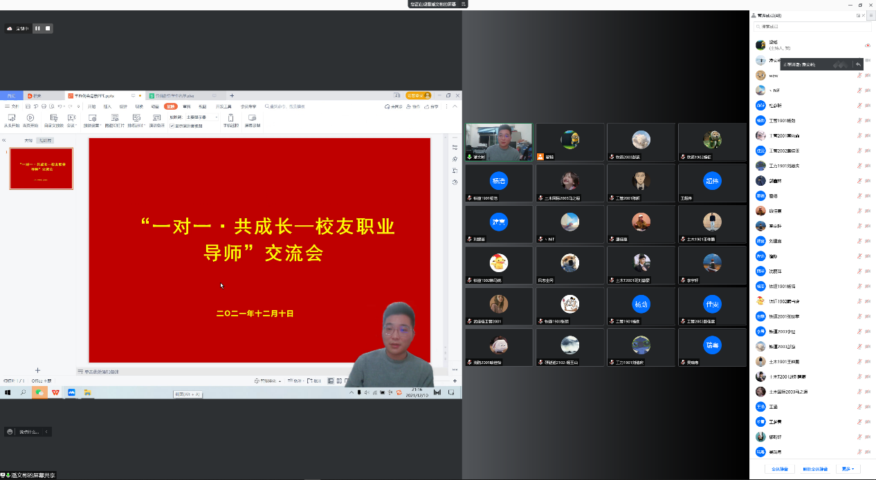 12月10日晚9点,由公司团委副书记潘文彬老师主持开展线上会议,为员工介绍了此次员工职业导师计划的工作安排及相关事项。本次活动从多家优质单位中择优选择了16位员工职业导师,通过bevictor伟德研究生会发放报名通知,并为报名的46名同学按照志愿匹配了合适的导师。