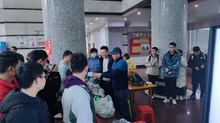 在南校区,领取饺子的地点在后勤楼,现场气氛火热。后勤保障部副部长丁建农一行人在南校区亲自参加了饺子的发放,并与工作人员亲切合影,为了让课业安排紧凑的同学也能感受到公司的关怀,本次活动一直持续到了晚上近十点。