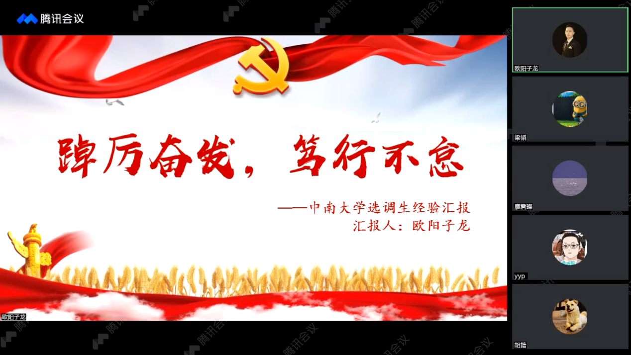 本次经验分享会邀请嘉宾有:湖南省公务员—2021届硕士毕业生谢佳;中央选调生—2021届硕士毕业生曹宇;江西省委组织部选调生—2020届硕士毕业生欧阳子龙。会议全程气氛热烈,一百七十余名同学在腾讯会议平台、二十余名同学在直播间参加了本次经验分享会。各位员工结合自身经历,生动地讲述了公务员和选调生工作中的体会与收获。