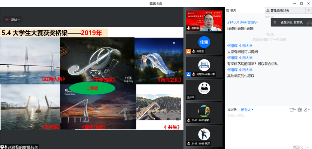 本次线上讲座,赵君黎教授以丰富的公路桥梁从业经验为基础,以“中交公规院杯世界老员工桥梁设计大赛”为依托,从历史回顾、基本要求、竞赛胜出、团队力量、案例介绍五个方面对大赛进行介绍。自2017年来,“中交公规院杯”已连续四年成功举办,是世界交通运输大会的重要组成部分,获得社会和高校的积极响应。