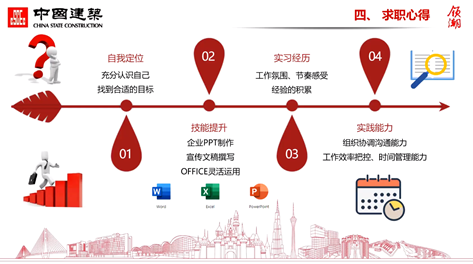 随后,由2022届硕士毕业生许春阳进行分享。许春阳师姐的求职分享分为四个部分:自我介绍、中国建筑国际集团简要介绍、实习经历、求职心得。许春阳师姐提到同学们需要进行自我定位,充分认识自己,根据自己的实际情况、优劣势来选择合适自己的岗位;在平时生活中灵活运用office系列软件,提升ppt制作、文稿撰写等能力;花时间思考实习的工作氛围和个人感受,以及自己是否适合房地产行业;提高自身的实践能力,例如:组织协调沟通能力、工作效率把控、时间管理能力等。