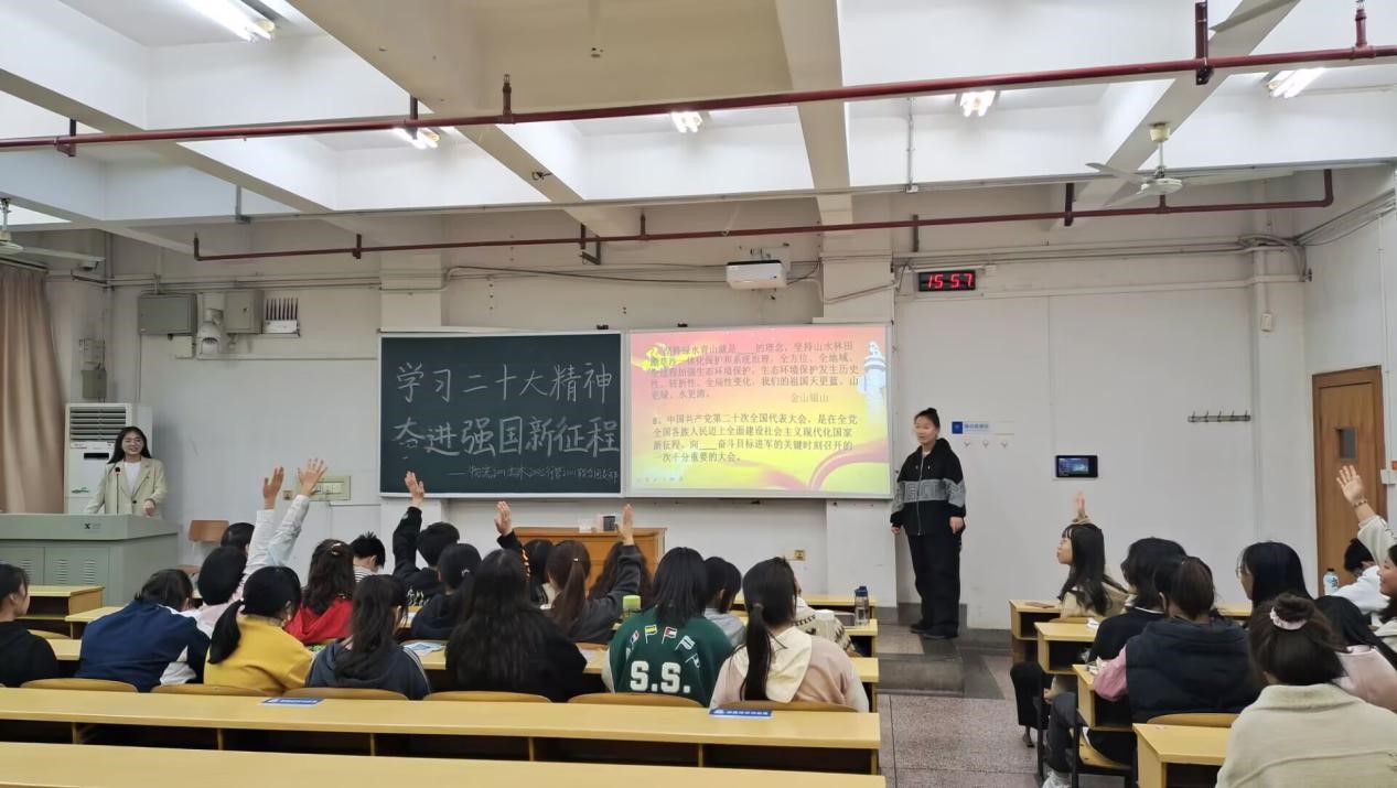 活动伊始,雷望红老师为同学们讲述党的二十大精神。内容主要分为四个部分,第一部分是中国特色社会主义的内涵,并就什么是中国特色社会主义进行互动提问,同学们积极发表意见。第二部分通过举例中国工程院院士何继善、普通技术人员张珍阐述党员所具备的各种优秀品质及党的优越性。第三部分论及中国式现代化的道路自信,人民在党的坚强领导带领下不断走向新胜利。最后结合党的二十大精神,谈及中国广大青年的担当使命,号召青年老员工要有使命感和责任感,不负国家,不负人民。