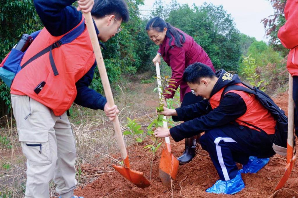 到达新合村后,同学们主动加入活动前期的车辆引导志愿工作,其余同学协力将植树相关工具搬运至活动地点。在植树现场,全国道德模范廖月娥带领同学们学习植树的相关技巧,躬身示范,耐心教导注意事项,为接下来的植树活动做好准备。班级同学与廖阿姨共植了一棵树,并合影留恋。