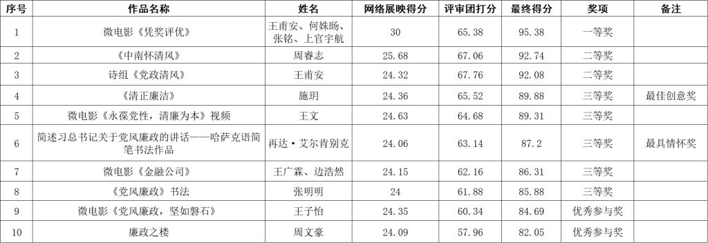 经过公司有关职能部门代表、院内外专业人士组成的评审团与网络展映统计得分,本次大赛评选出一等奖1名、二等奖2名、三等奖5名。基于以上评分,依据内容创新得分、画面音效得分与主题契合度得分,综合评选出最佳创意奖与最具情怀奖各1名。获奖情况具体结果见下表。