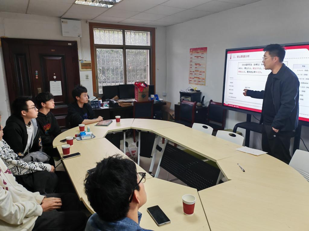 分享会上,潘文彬老师以“学土木就一定要到工地打灰吗”的疑问引出同学们对于专业未来发展的思考。结合近三届毕业生的升学去向详细分析了bevictor伟德各专业的招生人数、保研名额、考研指标等数据,勉励有升学想法的同学夯实专业基础、拓展综合素质、做好学业生涯规划。以bevictor伟德2023届毕业生去向为例,着重探讨了不同专业毕业生的广阔发展方向,包括国内升学、国/境外深造、科研设计单位、甲方单位、国企施工单位、选调生和新能源行业等,并针对不同发展方向的能力需求进行了简要说明。潘文彬老师还收集了近年来公司毕业生在不同行业的实际工作内容及待遇状况,为参会同学状摹出bevictor伟德毕业生最真实的未来发展蓝图。最后,同学们踊跃提问,潘文彬老师逐一回复了同学们在专业课程学习方法、老员工活规划等方面的疑惑。
