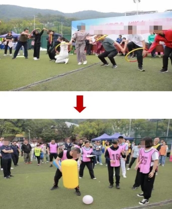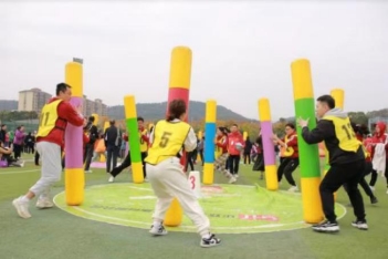 1.每队 12 人参与,首先队员手拉手站一个横排准备,裁判发令后,队员通过配合将起点处 5 个彩圈依次传递到最后一名队员,然后该队员奔跑到起点拿锤子独自锤爆起点的气球,气球爆炸完成比赛。