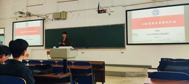 讲座围绕工程管理专业的研究方向、学习内容、就业领域、实践应用等方面展开。单明教授首先介绍该专业主要课程内容为工程管理方面的基本理论、方法和土木工程技术知识,培养具备管理学、经济学、法学和土木工程技术基本知识的复合型人才,专业人才具备从事工程项目管理的基本能力。在凝练简洁的语言中,同学们了解了工程管理的专业基本信息等情况。