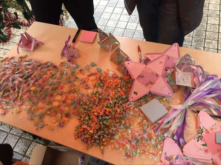 上午9:00,心协工作人员在升华公寓12、13、25栋楼下布置好了摊位,五彩的圣诞树,缤纷的糖果,精致的礼盒,都为这个飘着小雨的冬日增添了一份温暖。