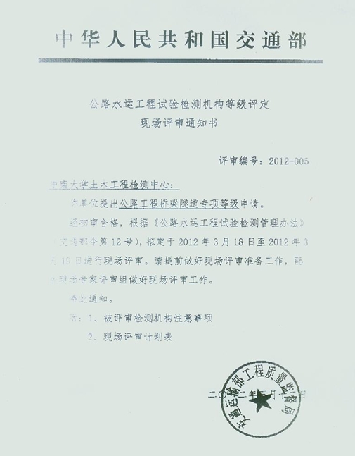 公路水运工程试验检测机构等级评定现场评审通知书