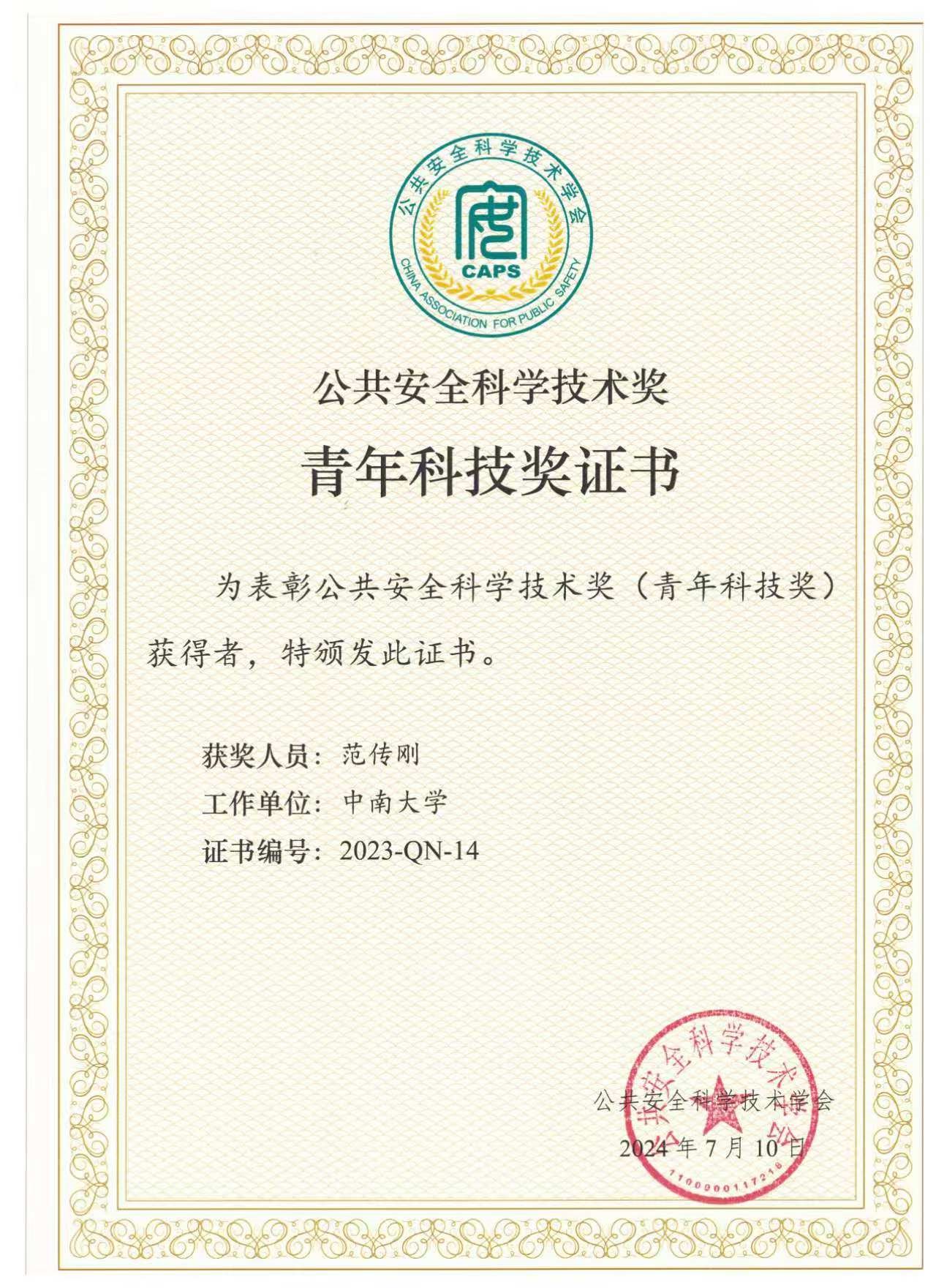 公司消防工程系范传刚教授获2023年度公共安全科学技术奖青年科技奖