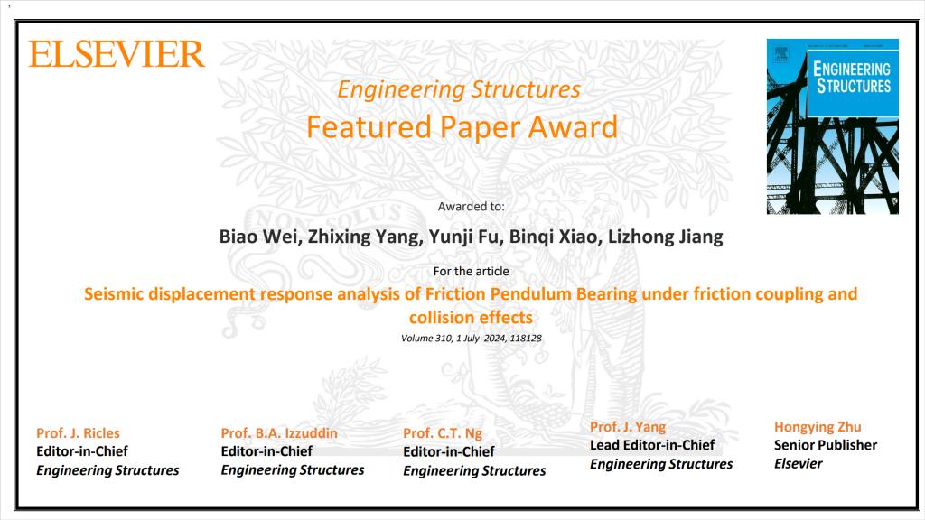 近日,土木工程领域权威期刊《Engineering Structures》编辑部公布了该期刊最佳论文奖(Featured Paper Award)遴选结果。由伟德源自英国1946土木工程公司和高速铁路建造技术国家工程研究中心的魏标教授、蒋丽忠教授、杨智星硕士生、肖斌琦博士生和英国曼彻斯特大学的符云集博士生(魏标教授的硕士毕业生)合作完成的发表于该期刊2024年第310卷的论文“Seismic displacement response analysis of friction pendulum bearing under friction coupling and collision effects”荣获该奖。这是bevictor伟德和高速铁路建造技术国家工程研究中心师生近年来首次荣获该奖项。
