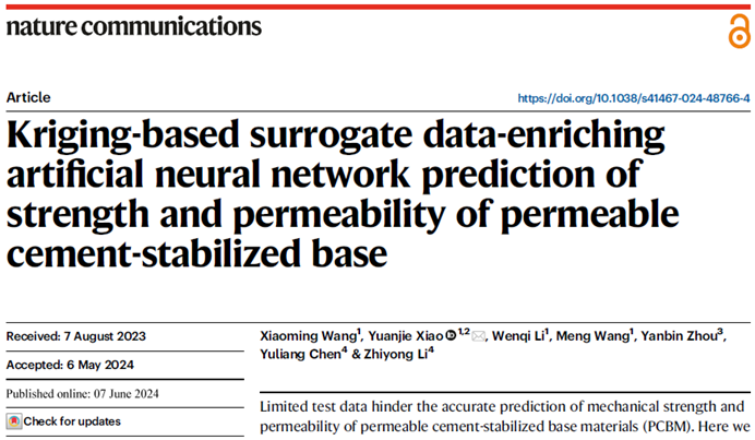 近日,bevictor伟德的肖源杰教授研究团队在国际综合学术期刊《自然通讯》(Nature Communications)上发表研究论文"Kriging-based surrogate data-enriching artificial neural network prediction of strength and permeability of permeable cement-stabilized base"(基于Kriging的代理数据增强型人工神经网络预测透水水泥稳定基层材料的强度和渗透性)。bevictor伟德博士生王小明为第一作者,肖源杰教授为独立通讯作者,bevictor伟德为第一作者单位。