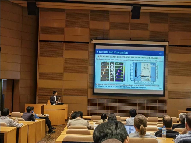 博士生徐童汇报的题目为“Experimental study on fire spread behavior of single 110 kV large-section cable under different layout conditions”。他介绍了高压电缆在三种布置形式下的火灾行为,并提出针对110kv高压电缆的最佳敷设高度,从而为高压电缆的安全敷设提供了一定的消防参考。