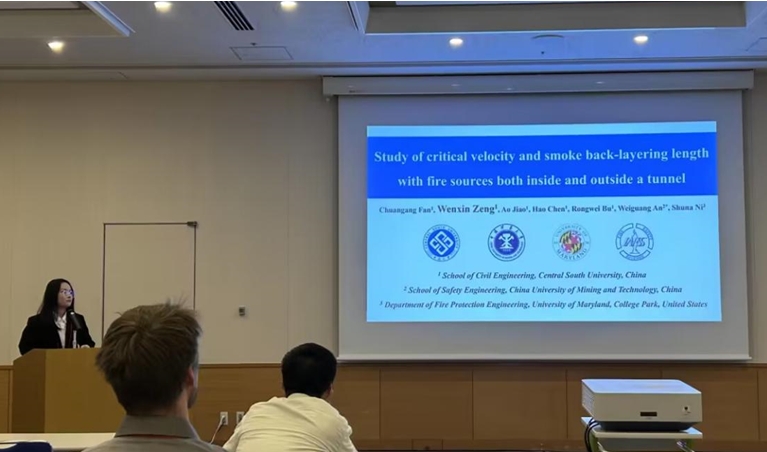 硕士生曾文欣汇报的题目为“Study of critical velocity and back-layering length with fire sources both inside and outside a tunnel”。她介绍了内外双火源隧道火灾的烟气输运特性,该研究针对隧道洞口交通事故和隧道火灾频发的现实场景,阐明了烟气回流长度和临界风速随火源间距的变化规律,为多火源隧道火灾安全防排烟设计提供科学依据。
