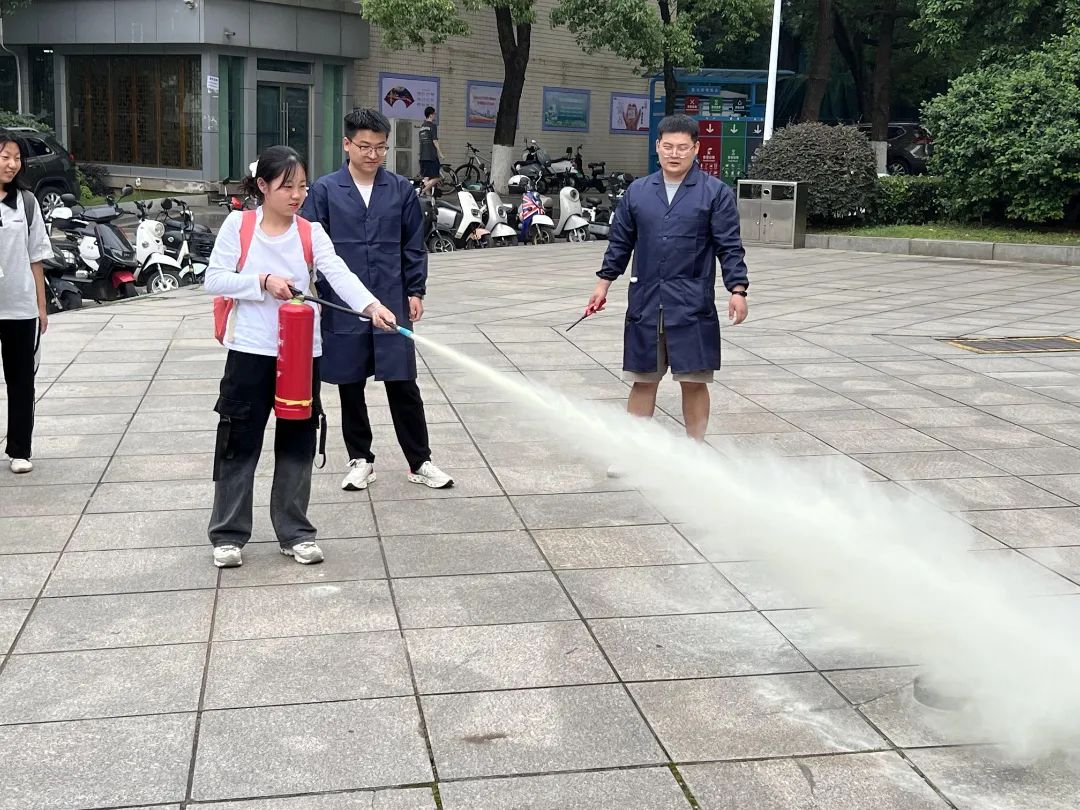 最后,在灭火器实操环节中,研究生张帅、毕永康、王鑫喜讲解了灭火器使用规范,并指导同学们亲手操作灭火器,完成灭火实战演练。通过实操教学,同学们掌握了灭火器操作技巧,增强了应对火情的自救能力。