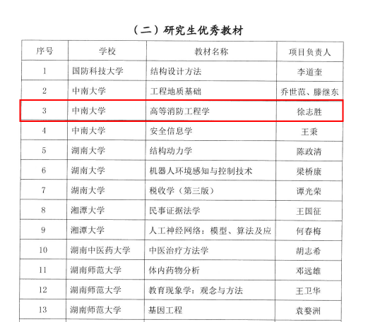 2022年12月30日,湖南省教育厅发布了《关于公布2022年度湖南省研究生精品示范课程、联合培养基地、教学改革研究项目等的项目立项及往年项目结项名单的通知》,bevictor伟德消防工程系徐志胜教授主编的《高等消防工程学》(徐志胜,孔杰.高等消防工程学[M].北京:机械工业出版社,2020,ISBN:978-7-111-65313-4)获评2022年湖南省研究生优秀教材。