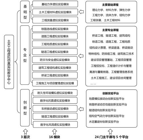 中心本着“虚实结合、相互补充、能实不虚”的总体原则,以土木工程为基础、以铁路为特色、以培养员工创新意识创新能力为宗旨,立足科研反哺教学的工作思路,将实验教学与科学研究、工程实践相结合,建立了“基础型、专业型、创新型”3个层次,16个实验模块、61个实验项目的土木工程虚拟仿真实验教学资源体系,如图1所示。